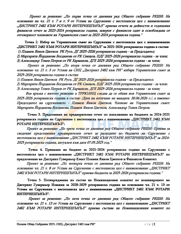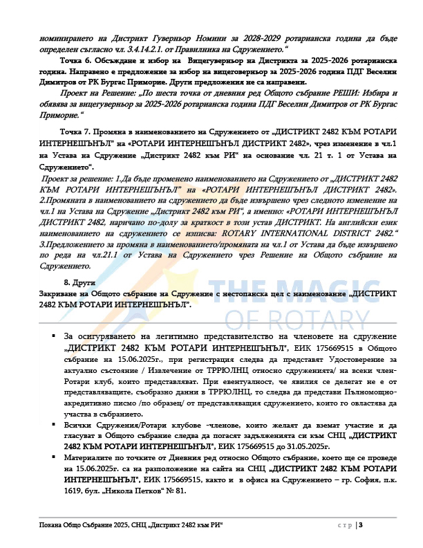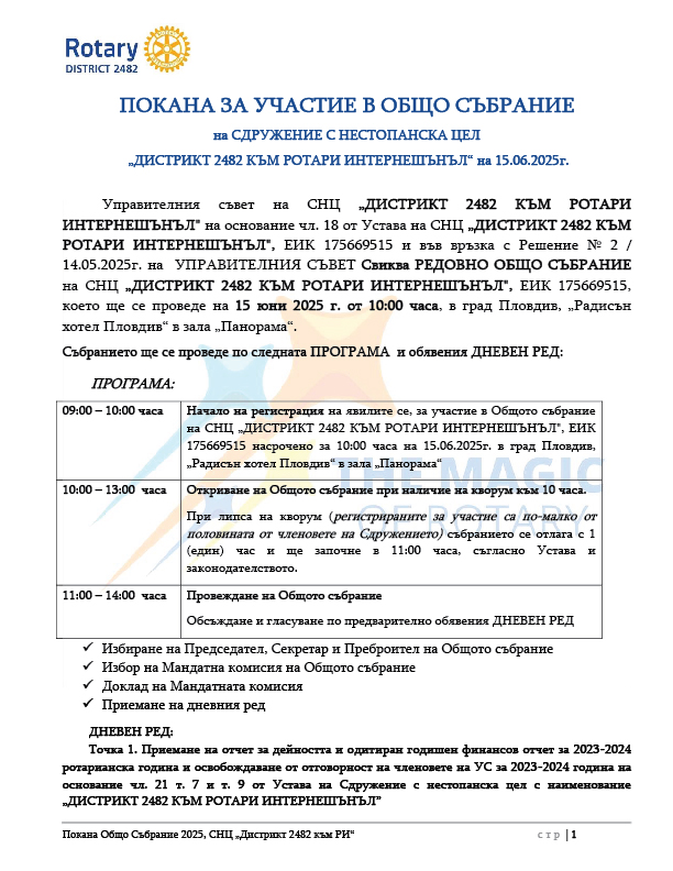 В качеството ми на председател на УС на СНЦ „Дистрикт 2482 към РИ“ и Дистрикт Гуверньор на Д2482 за 2024-2025 година, имам удоволствието да ви поканя да участвате в общо събрание на Сдружението, които ще се състои на 15-ти юни 2025 година от 10:00 часа в град Пловдив, „Радисън хотел Пловдив“, зала „Панорама“ .