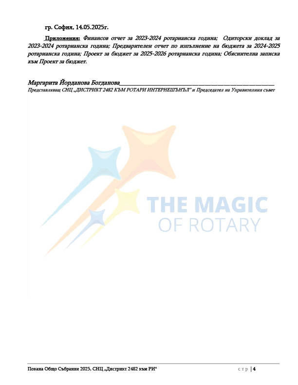 Приложена е Покана с дневен ред на Общото събрание, както и Акредитивно писмо. В пакета документи ще намерите и Предварителен отчет по изпълнение на бюджета за 2024-2025 ротарианска година на СНЦ „Дистрикт 2482 към РИ“, актуален към дата 07.05.2025 год.; Годишен финансов отчет за 2023-2024 ротарианска година; Одиторски доклад 2023-2024; Проект на Бюджет за 2025-2026 ротарианска година на СНЦ „Дистрикт 2482 към РИ“; Обяснителна записка Бюджет 2025-2026.