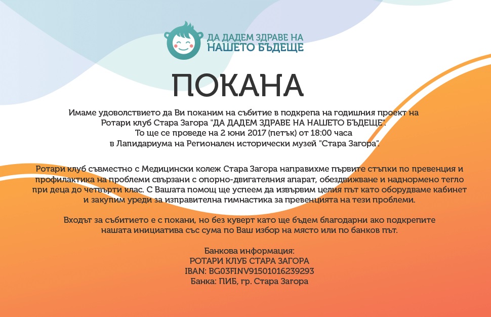 Дата: 02/06/2017Ротари клуб Стара Загора организира събитие за набиране на средства в подкрепа на основния проект за 2016-17г.:
