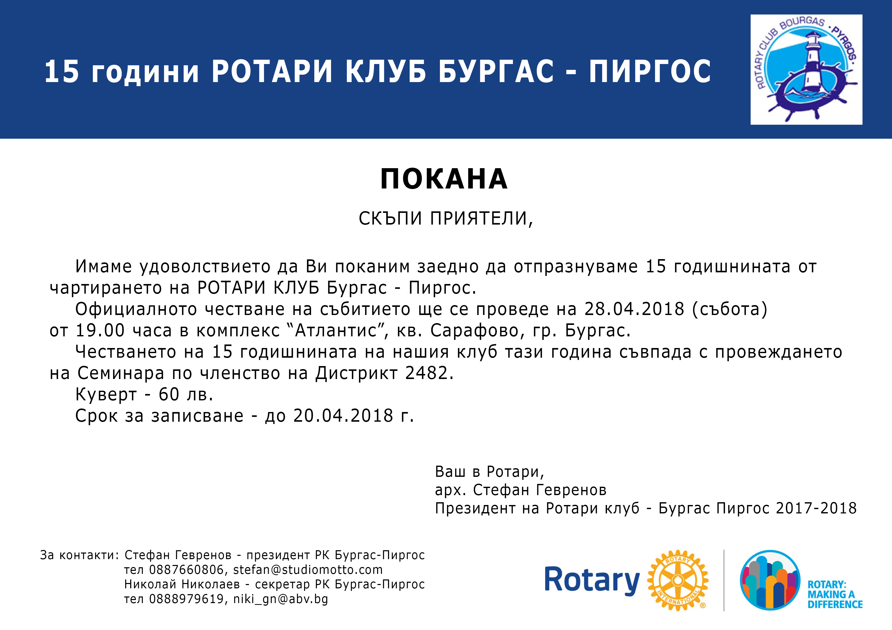 Начална дата: 28/04/2018 Крайна дата: 29/04/2018РОТАРИ КЛУБ БУРГАС-ПИРГОС Ви кани на 15-тия рожден ден на клуба, който ще се проведе на 28.04.2018г. (събота) от 19:00 часа в ресторанта на хотелски комплекс Атлантис - гр.Бургас. Официалното честване съвпада с провеждането на семинара по членство на Д2482.