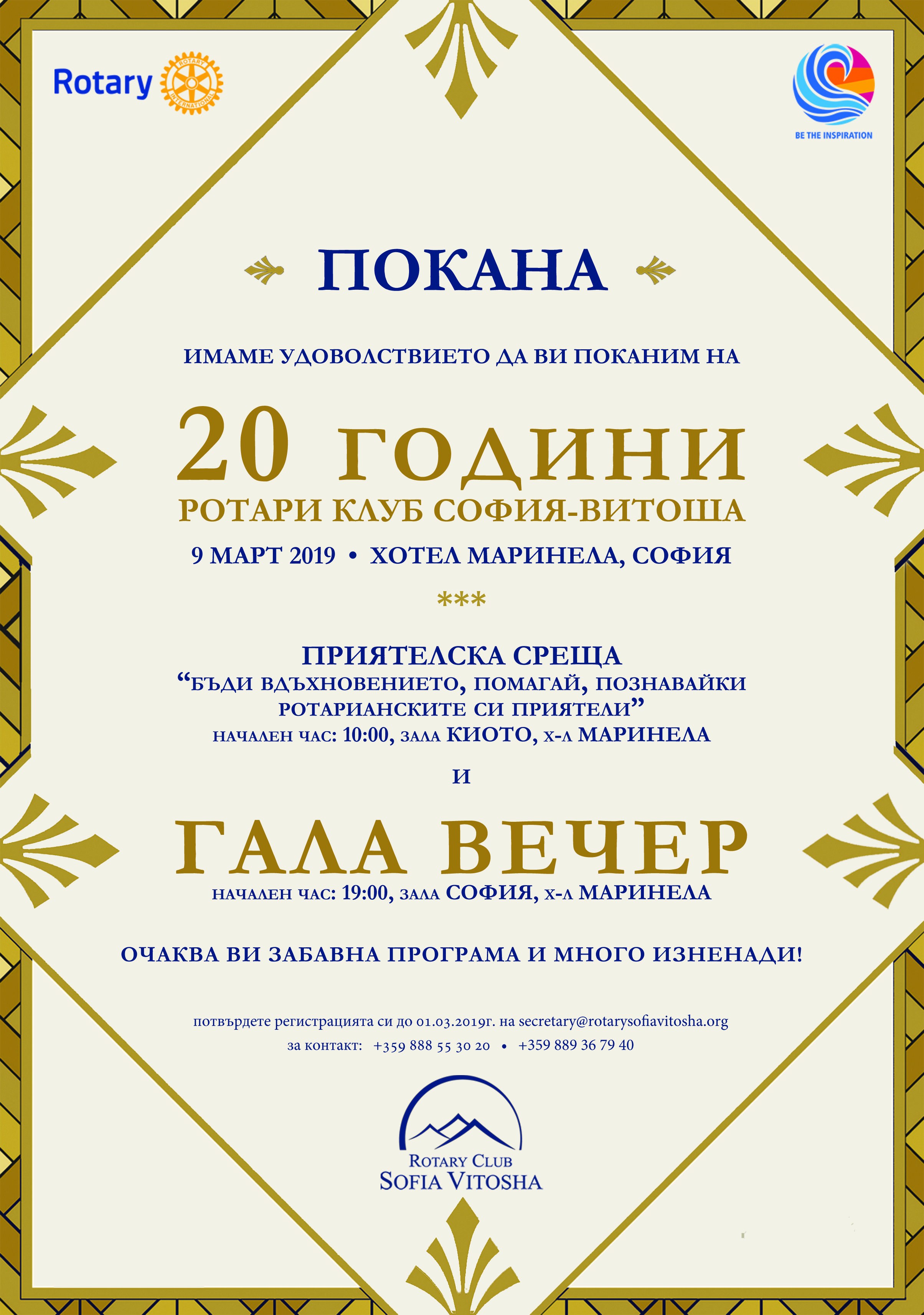 Имаме удоволствието да Ви поканим на уикенд честване по повод 20 годишнината на Ротари клуб София-Витоша от 8-10.03.2019 г. в гр.София.