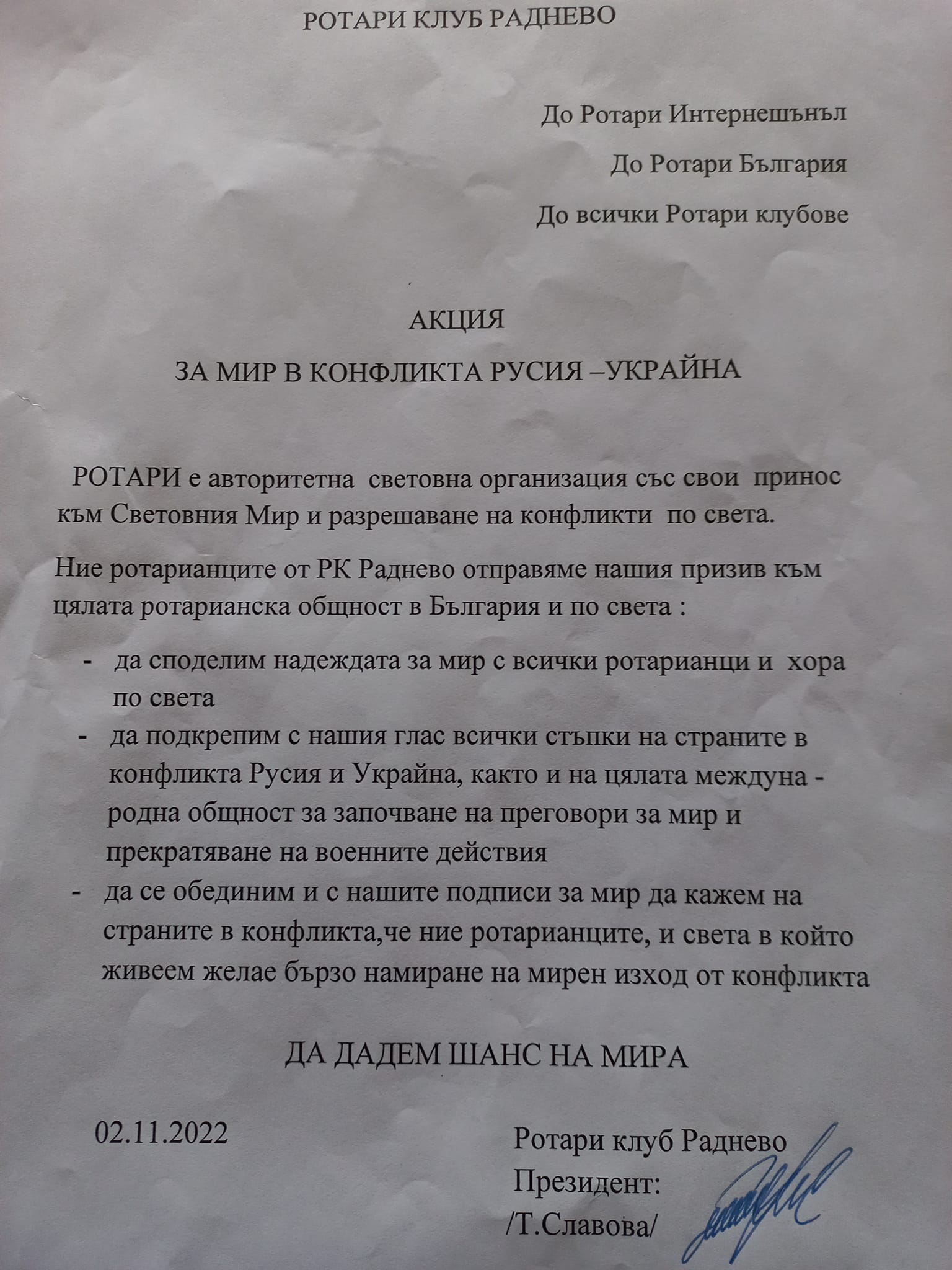 Акция за мир Начална дата: 06/11/2022 Крайна дата: 31/12/2022 Акция за мир на Ротари Клуб Раднево стартира. Очакваме реакция на нашите приятели от всички клубове ,на Ротари България и на Ротари Интернешънъл. 1667749610_deklaracia.jpg