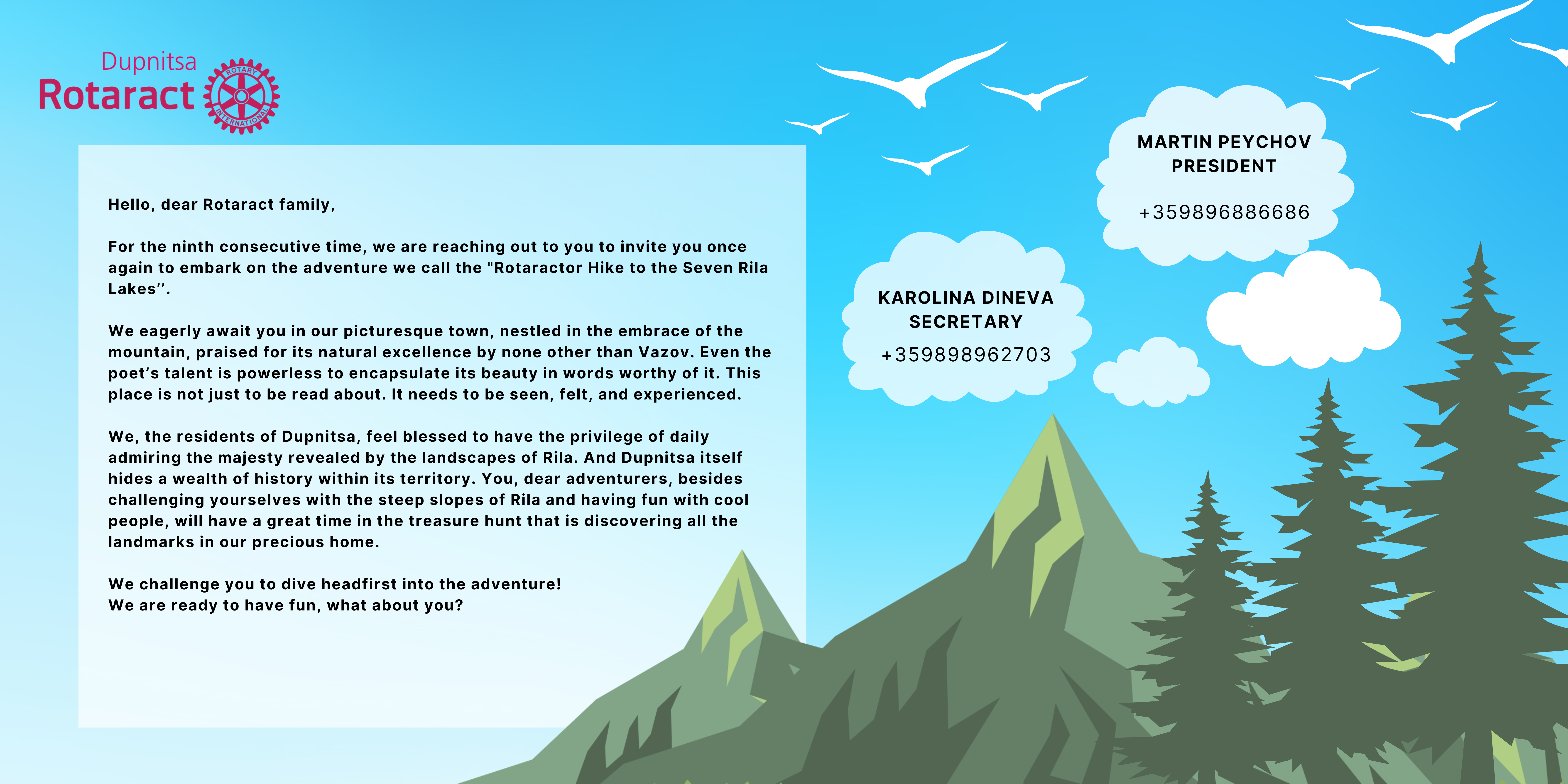 Вълнуваме се да Ви споделим, че дойде време за едно от най-чаканите събития през годината - ,,Ротаракторски поход до Седемте Рилски езера", организиран от Ротаракт клуб Дупница!