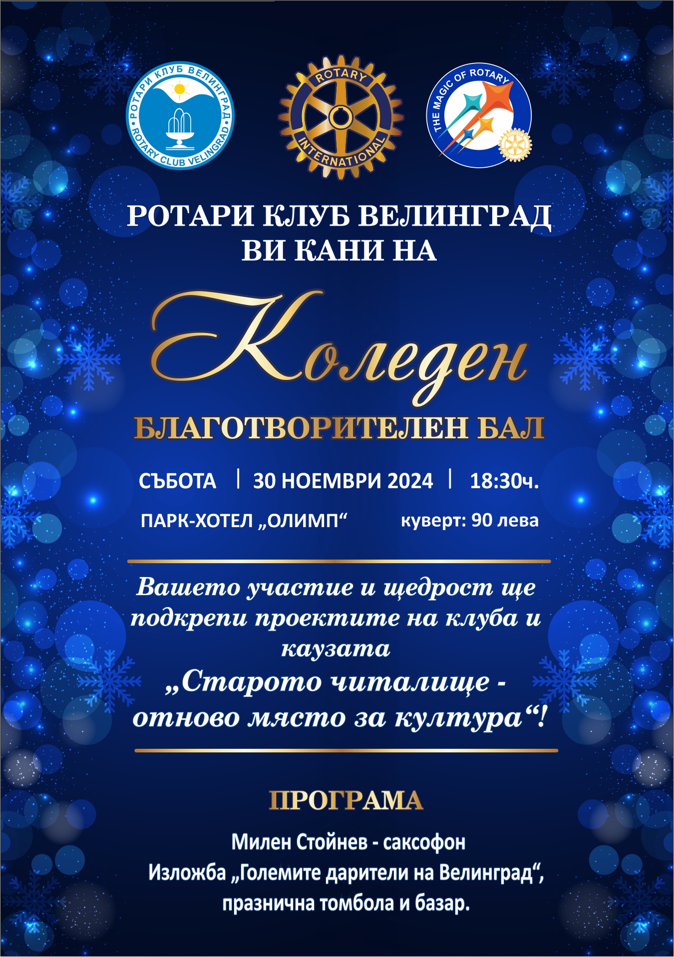 Коледен благотворителен бал на РК-Велинград Дата: 30/11/2024 Коледен благотворителен бал на Ротари клуб - Велинград Информация за настаняване и потвърждение за участие: 0885 22 40 04, tempovelingrad@abv.bg, Елена Баева 1731305624_rotary_-_pokana_(1).jpg