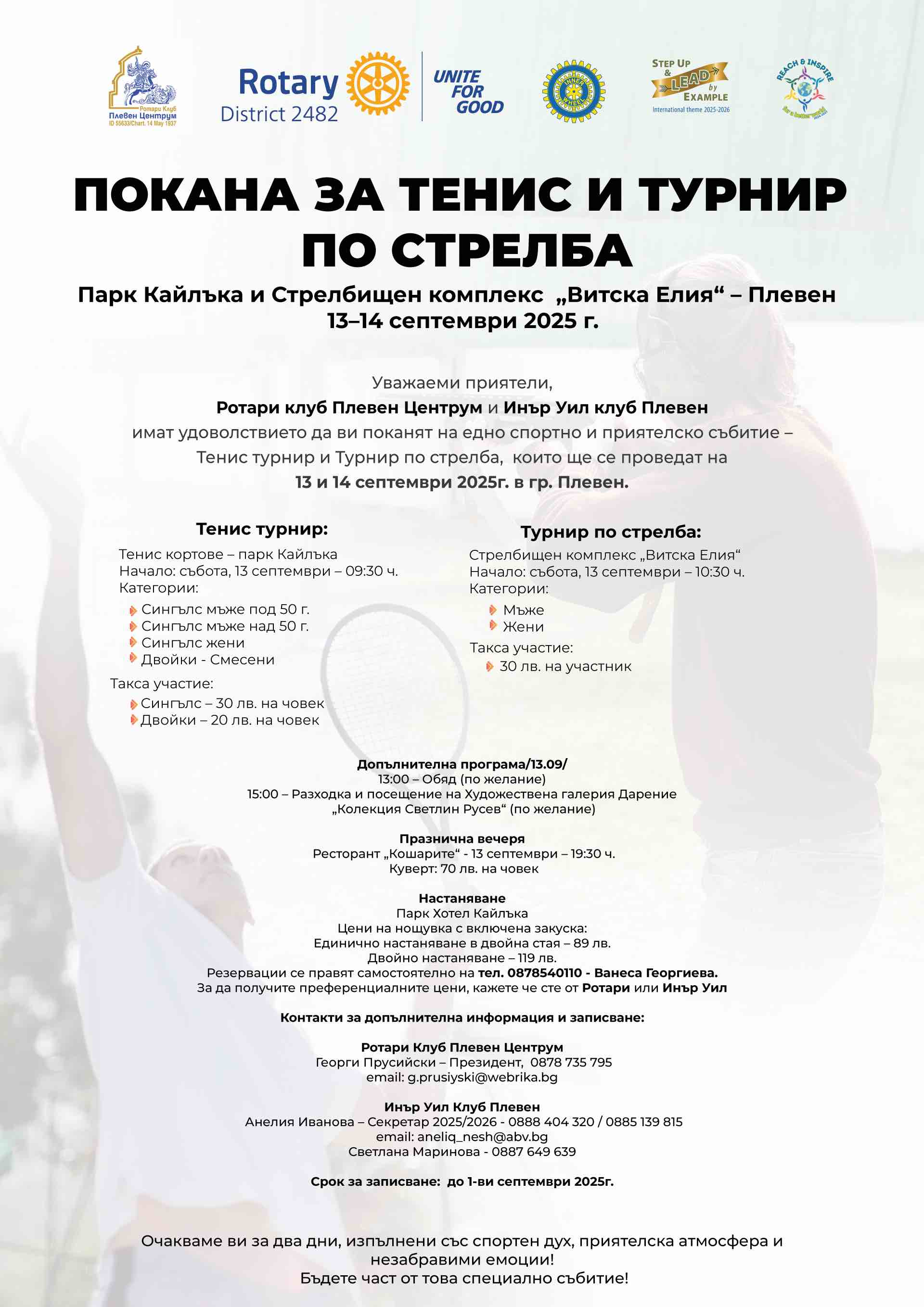 Ротари клуб Плевен Центрум и Инър Уил клуб Плевен имат удоволствието да ви поканят на едно спортно и приятелско събитие – Тенис турнир и Турнир по стрелба, които ще се проведат на 13 и 14 септември 2025 г. в гр. Плевен.