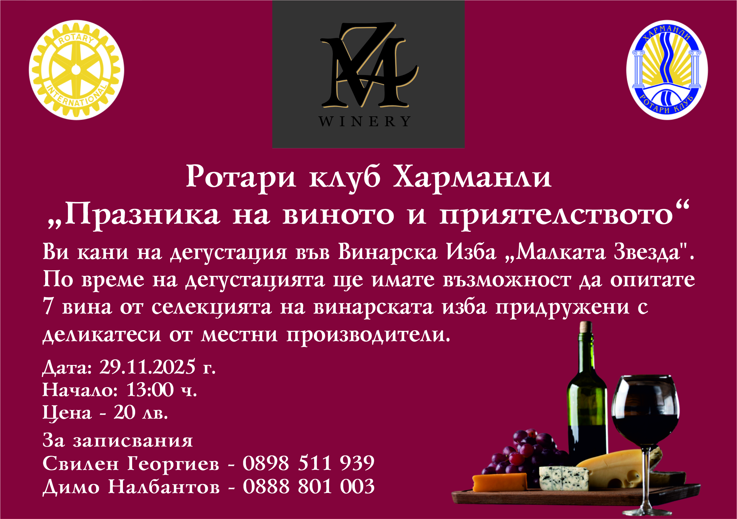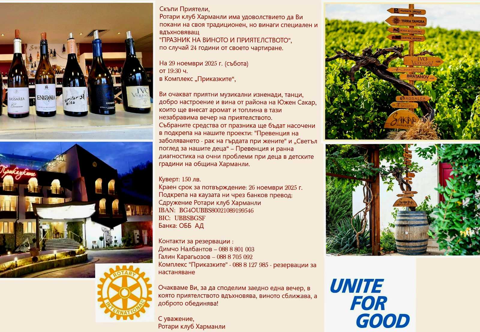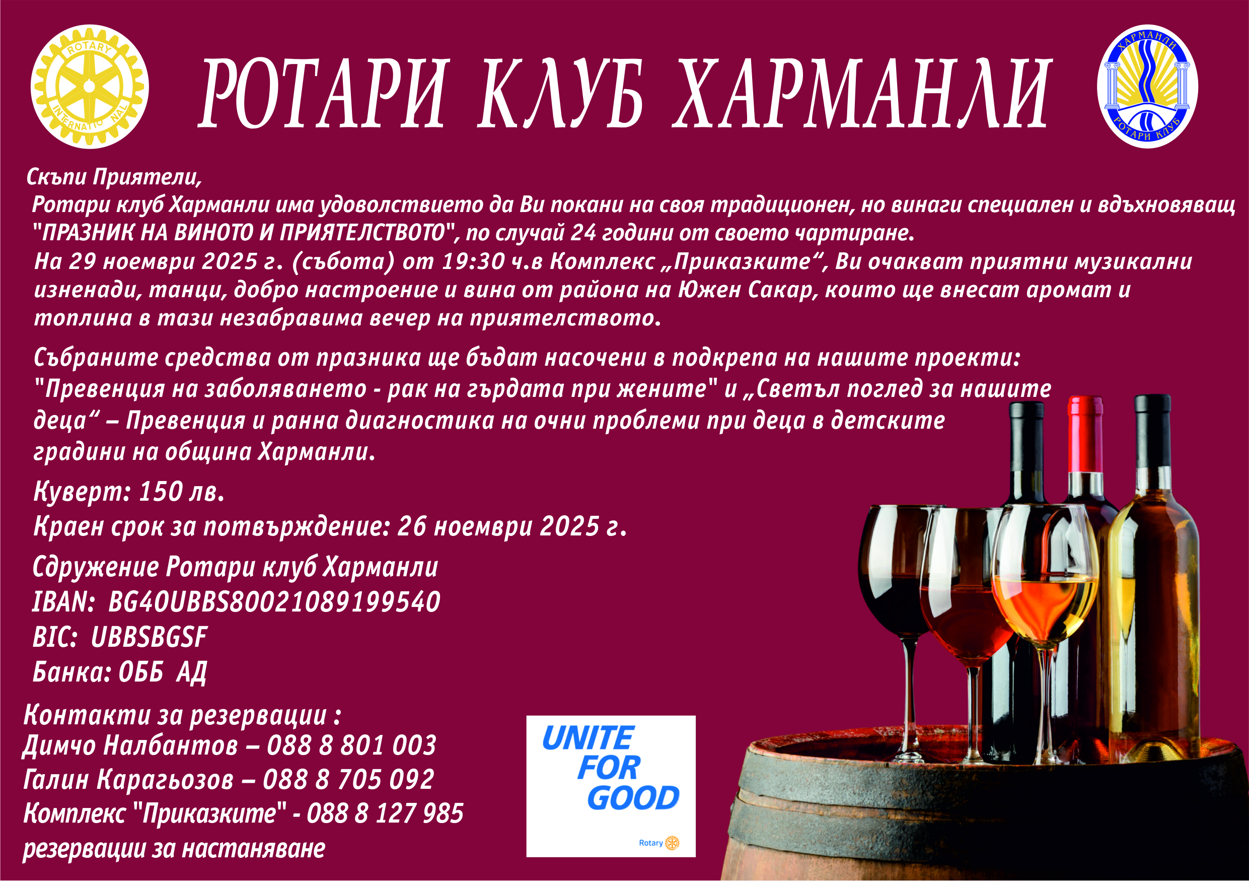 Начална дата: 29/11/2025 Крайна дата: 30/11/2025Скъпи Приятели, Ротари клуб Харманли има удоволствието да Ви покани на своя традиционен, но винаги специален и вдъхновяващ "ПРАЗНИК НА ВИНОТО И ПРИЯТЕЛСТВОТО", по случай 24 години от своето чартиране. На 29 ноември 2025 г. (събота) от 19:30 ч. в Комплекс „Приказките“, Ви очакват приятни музикални изненади, танци, добро настроение и вина от района на Южен Сакар, които ще внесат аромат и топлина в тази незабравима вечер на приятелството. Събраните средства от празника ще бъдат насочени в подкрепа на нашите проекти: "Превенция на заболяването - рак на гърдата при жените" и „Светъл поглед за нашите деца“ – Превенция и ранна диагностика на очни проблеми при деца в детските градини на община Харманли. Куверт: 150 лв. Краен срок за потвърждение: 26 ноември 2025 г. Подкрепа на каузата ни чрез банков превод: Сдружение Ротари клуб Харманли IBAN: BG4ОUBBS80021089199546 BIC: UBBSBGSF Банка: ОББ АД Контакти за резервации : Димчо Налбантов – 088 8 801 003 Галин Карагьозов – 088 8 705 092 Комплекс "Приказките" - 088 8 127 985 - резервации за настаняване Очакваме Ви, за да споделим заедно една вечер, в която приятелството вдъхновява, виното сближава, а доброто обединява! С уважение, Ротари клуб Харманли