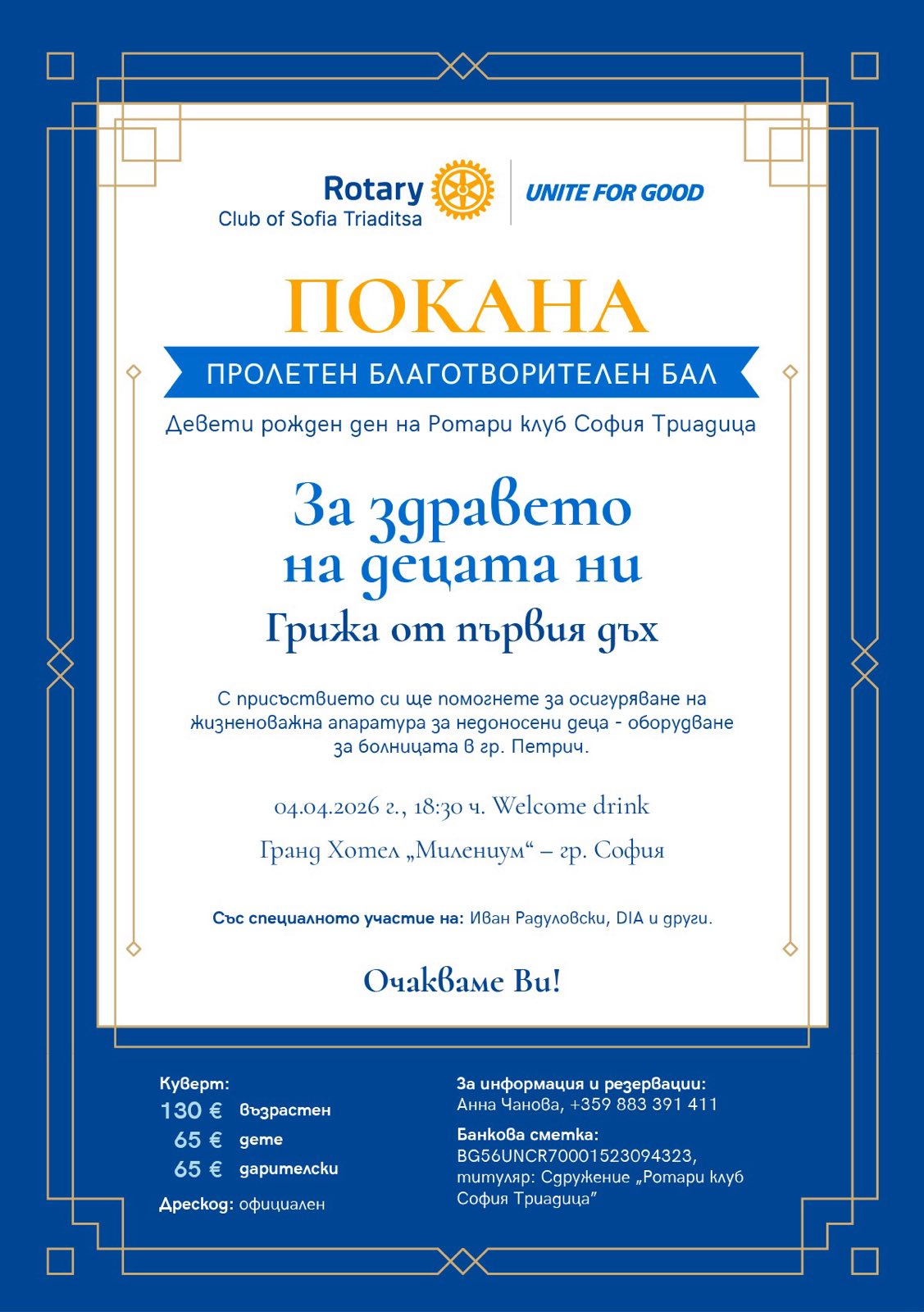 С радост Ви каним да присъствате на нашия традиционен Пролетен благотворителен бал, който ще се проведе на 04.04.2026 г. в х-л Grand Hotel Millennium Sofia.