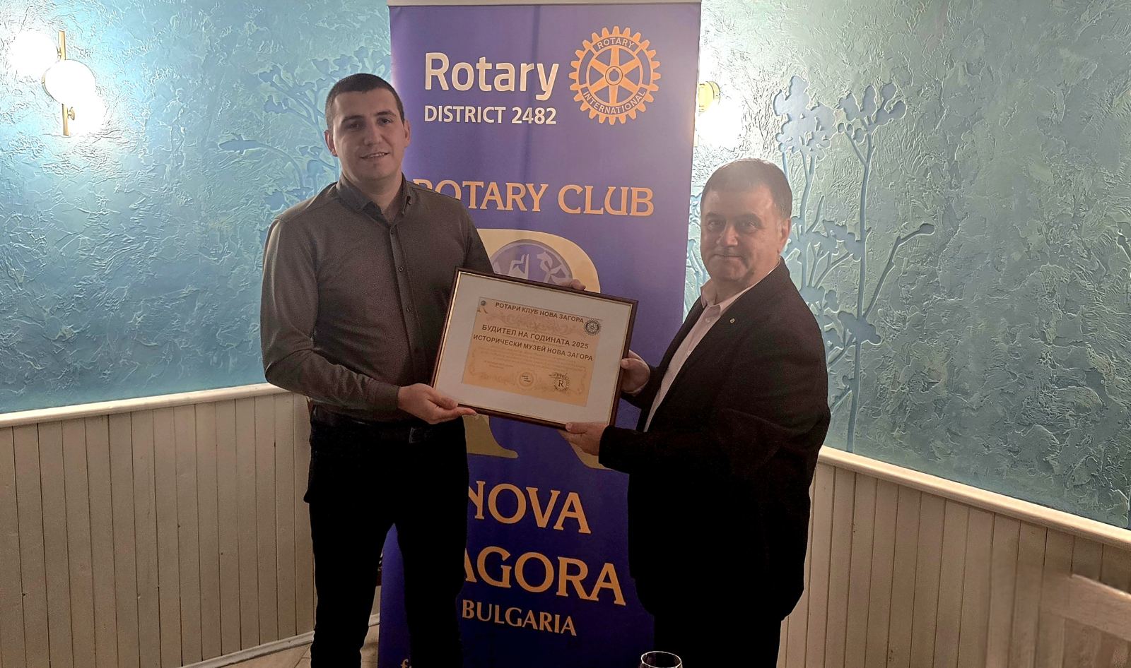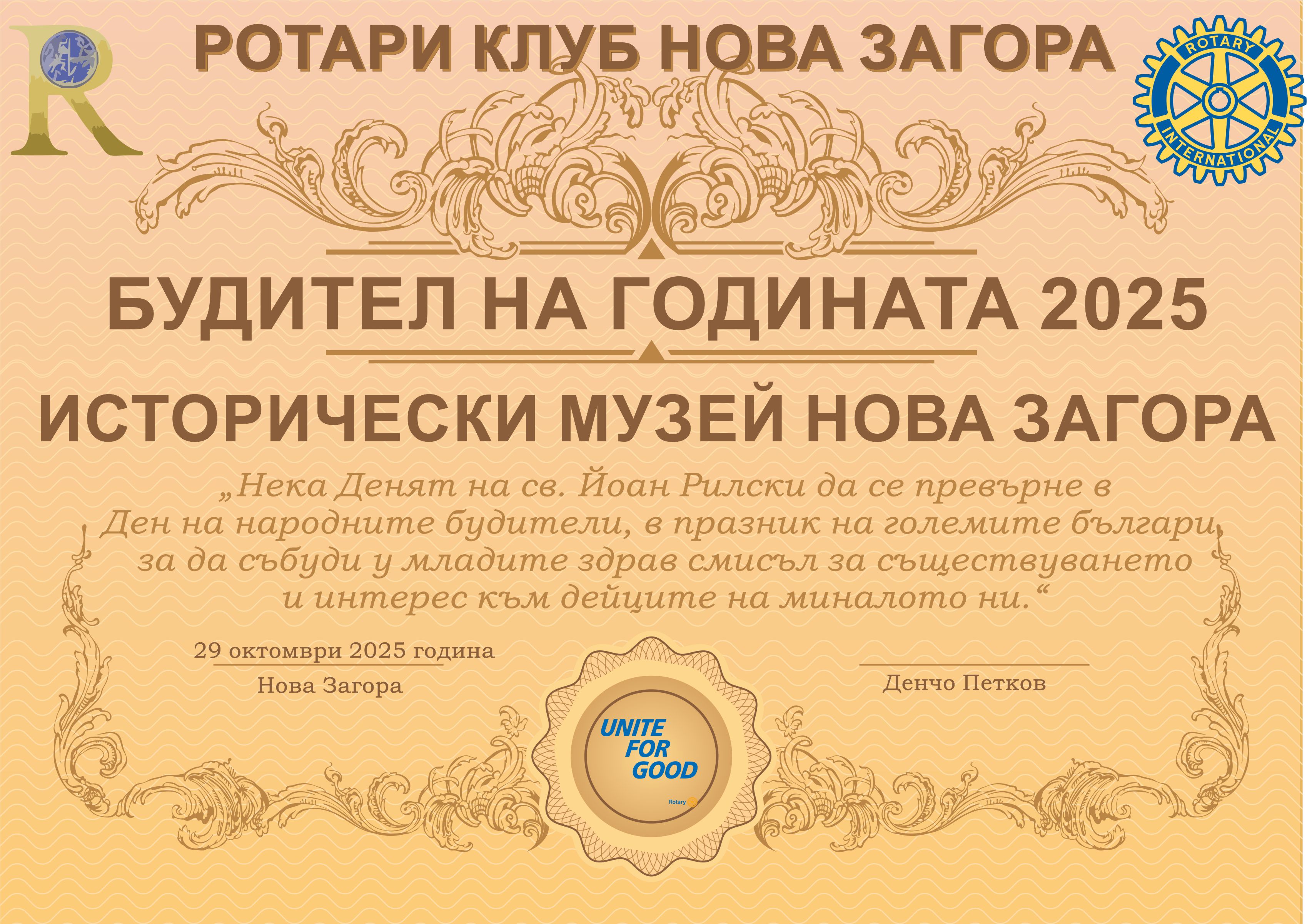 Ротари клуб Нова Загора връчи ежегодното си отличие Будител на годинатаВ навечерието на 1-ви ноември на тържествена сбирка, Ротари клуб Нова Загора връчи ежегоднoтo си отличие "Будител на годината". Носител на престижния приз за 2025 година стана Исторически музей Нова Загора. Младият и изключително амбициозен екип на музея заслужено бе удостоен с годишното отличие. Музеят притежава едни от най-богатите колекции в страната, която постоянно се допълва от неуморната работа на младите специалисти.